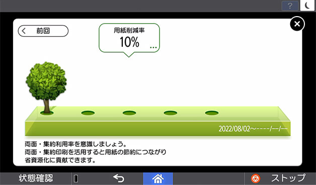 利用者や複合機ごとの総印刷ページ数、両面利用率、集約利用率、用紙削減率といったeco指数や管理者からの任意のメッセージを操作パネル上に表示可能。使用状況を可視化することで、環境負荷低減を促進します。