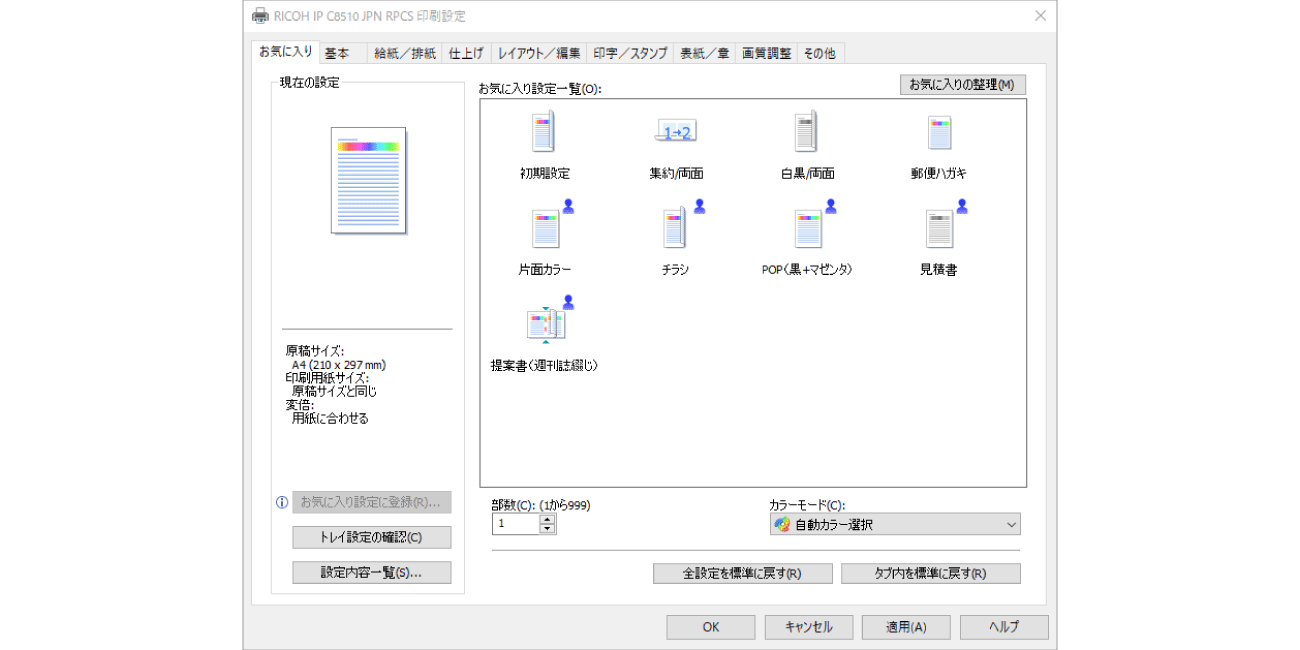 利用頻度の高い印刷設定を保存して呼び出せる「お気に入り」など、一目でわかりやすいドライバー画面を採用しました。どなたでも簡単にご利用できます。