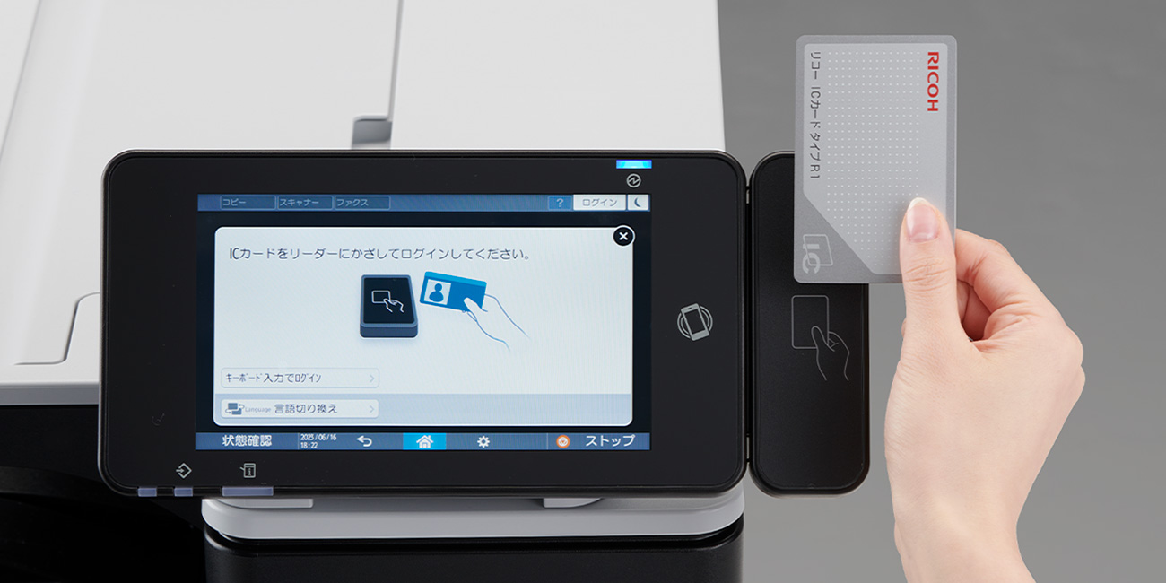非接触ICカード「FeliCa」「MIFARE」「eLWISE」を用いた個人認証システムとして、リコー 個人認証システム AE2、RICOH カンタンセキュアプリント for Cloudをオプションでご用意。ICカードの汎用領域の情報で認証したり、Windows Active DirectoryやLDAPと連携することが可能です。また、オンデマンド印刷に標準対応し、印刷物の取り違えや取り忘れを抑止し、セキュリティーの向上に貢献します。ユーザーごとに使える機能、権限を設定し、TCOの削減効果も期待できます。