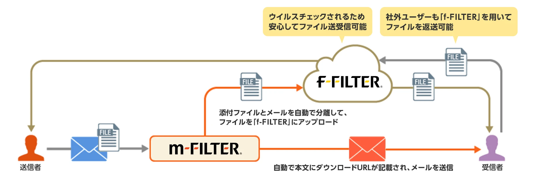 「m-FILTER」と「f-FILTER」の連携によりメール本文と添付ファイルを自動で分離しオンラインストレージを用いたファイル転送を行います。アカウント認証により、パスワードレスでセキュアな添付ファイルの送受信が可能です。