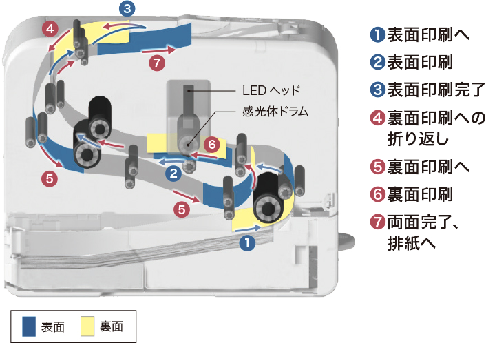 高精細に表現できる1,200dpi LED ヘッド採用により、画像を作るための光を照射する「LED ヘッド」と「感光体ドラム」の距離を縮めるとともに、用紙搬送経路を改善。両面ユニットを内蔵させることで圧倒的なコンパクト設計を実現しました。お客様対応をする窓口に置きたい、デスク下に置きたい、棚のあいたスペースに置きたいなど、さまざまなニーズに合わせた設置が可能です。