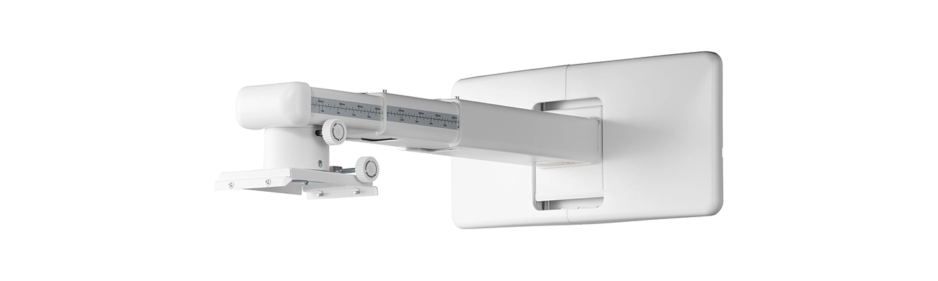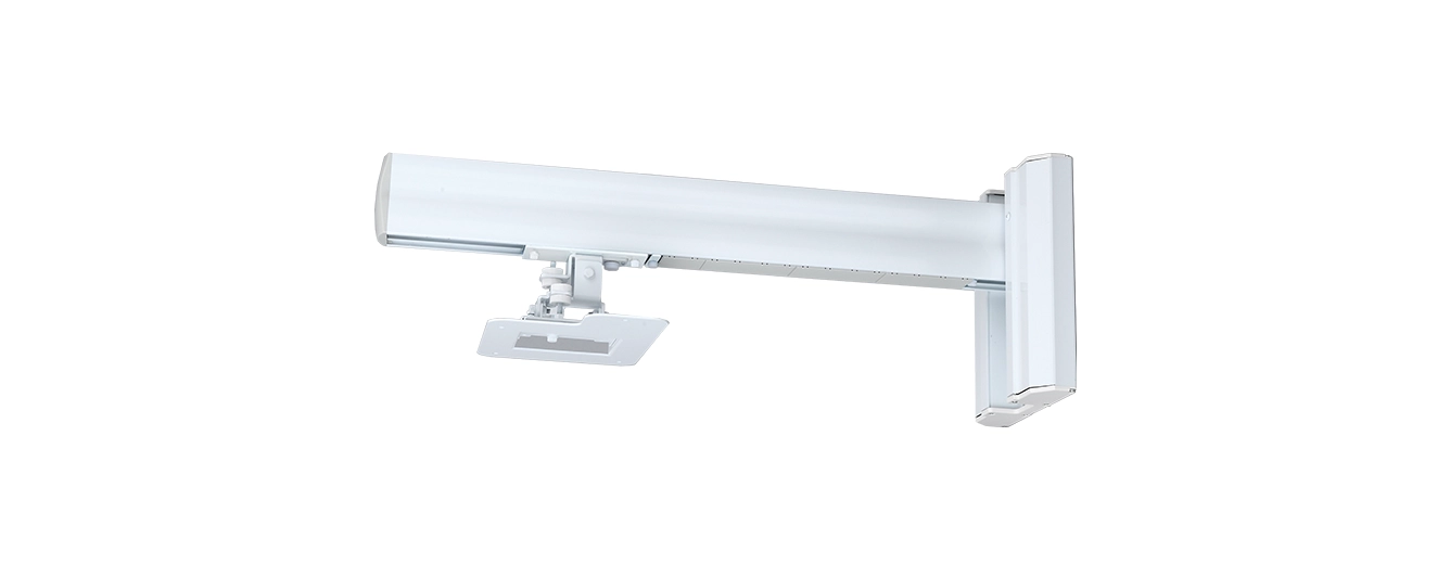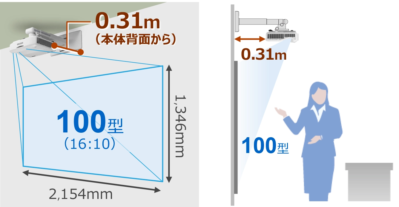 投映距離が短く、比較的狭い場所でも大画面を投映できます。また、天吊り設置の場合は、投写面の前で説明してもまぶしくなく、映り込みも最小限に抑えられます。