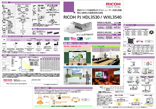 本ページで紹介した特長や周辺機器などをまとめた、RICOH PJ HDL3530/WXL3540の紹介カタログチラシをダウンロードいただけます。(A3両面・二つ折り)