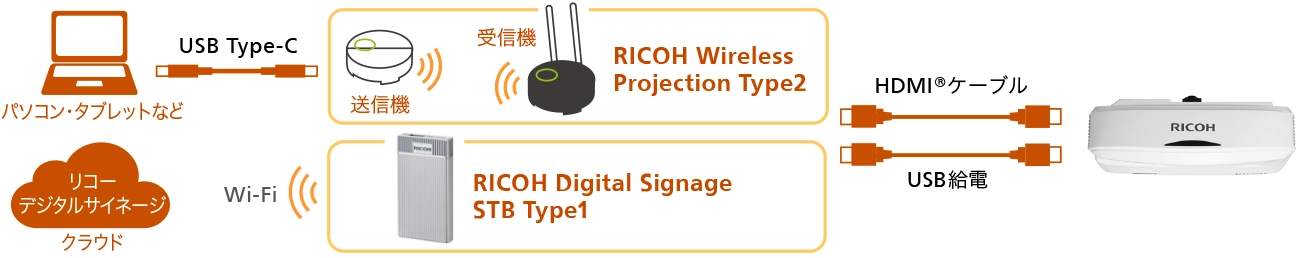 RICOH Wireless Projectionの他、MiracastやChromecastTMレシーバーなど汎用的なミラーリングデバイスにもUSB(ケーブル)による給電ができ、お好みのスタイルによるワイヤレス投映を実現します。また、RICOH Digital Signage STB Type1への給電も可能です。