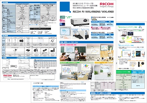 本ページで紹介した特長などをまとめた、RICOH PJ WXL4960NI/4960の紹介カタログチラシをダウンロードいただけます。(A3両面・二つ折り)
