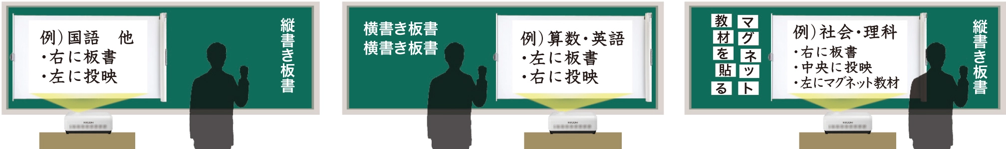 下図のように、各教科・授業ごとに投映位置を設定することで、板書を邪魔せず黒板を自在に使えます。