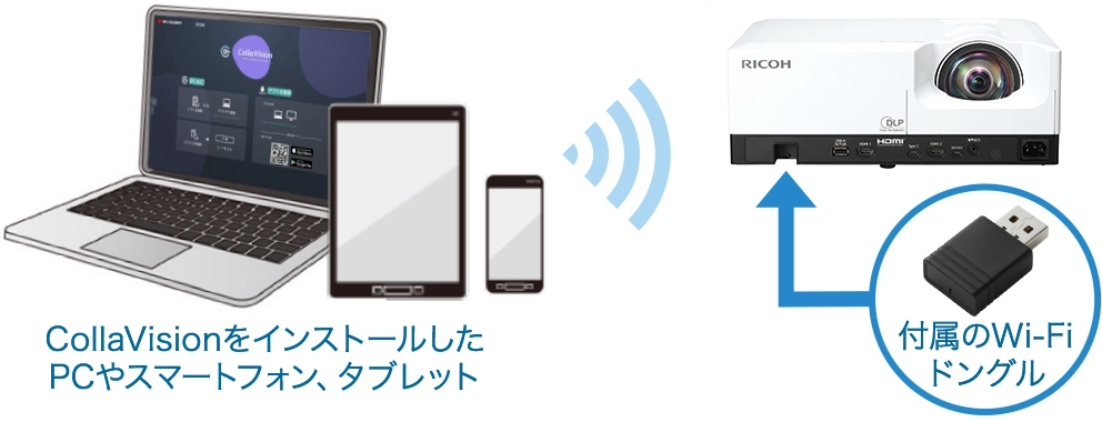 ネットワーク投映アプリケーション「CollaVision」にて、投映・書込み(アノテーション)・PC操作をワイヤレスで実現します。