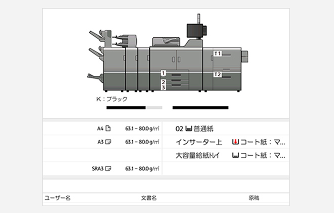 ジョブ管理機能の簡易画面を表示し、リピート印刷時などにタッチパネルから簡単に印刷設定が可能です。オペレーターの負荷を軽減することで、作業効率の向上に貢献します。