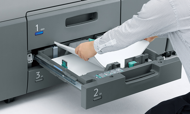 給紙中に青色に光るアクティブトレイインディケーターを各トレイに採用。稼働中のトレイが一目でわかるため、他のトレイへの用紙補給がスムーズに行なえます。