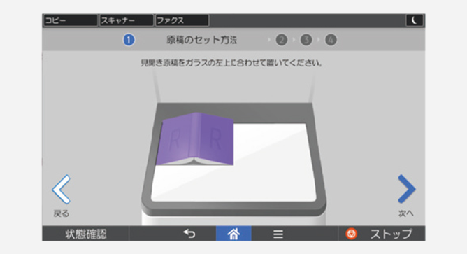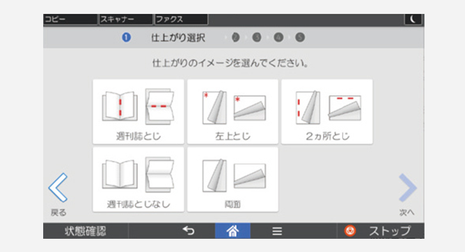 仕上がりイメージを見ながら後処理やスタンプ印字が可能な「会議資料コピー」や、本の中央や周囲の影を消去してコピーできる「ブック原稿影消しコピー」など、便利なアプリケーションを搭載。専任オペレーターがいない現場で効果を発揮します。