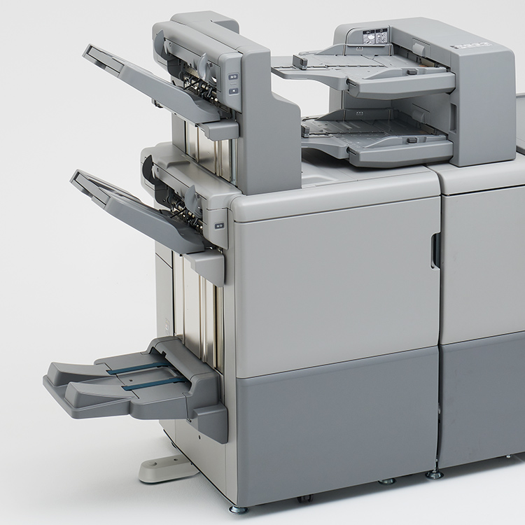 スタック枚数 3,000枚(A4ヨコ)のフィニッシャー。65枚のステープルをはじめ、丁合、仕分け、パンチ穴開けまで自動化します。