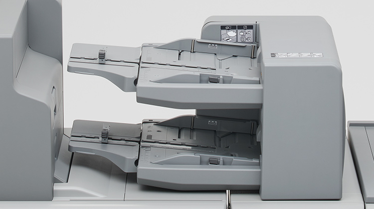 紙揃え機能を搭載したスタック枚数3,500枚(A4横送り)のフィニッシャー。新たに上段 1,000枚、下段 2,500 枚に対応したシフトトレイを採用。2段のシフトトレイによるリミットレス排紙も可能になり、優れた生産性を実現します。また、最大30 枚*1120ページの中綴じ製本が可能で、不定形サイズの中綴じにも対応。最大6枚の二つ折り*2や、2穴パンチ機能*3にも対応しています。