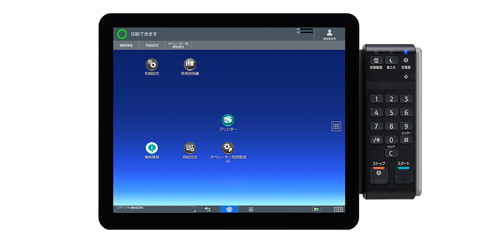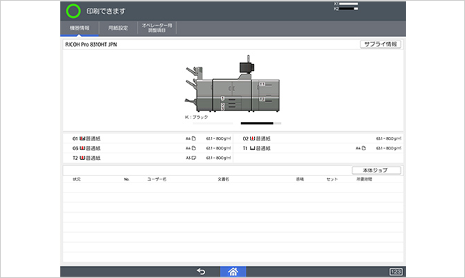 オペレーションパネルのトップ画面上にジョブ情報、各給紙トレイの用紙情報やトナー残量を表示しています。他の作業をしながらでもマシンの状態が一目でわかるため、オペレーションがさらに効率的になりました。