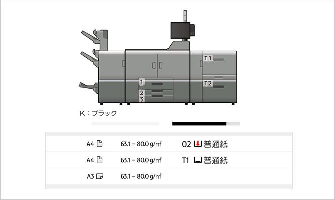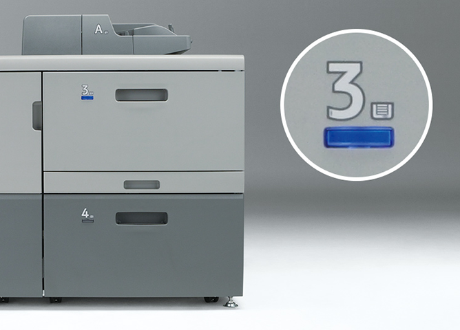 給紙中に青色に光るアクティブトレイインディケーターを各トレイに採用。稼働中のトレイが一目でわかるため、他のトレイへの用紙補給がスムーズに行なえます。