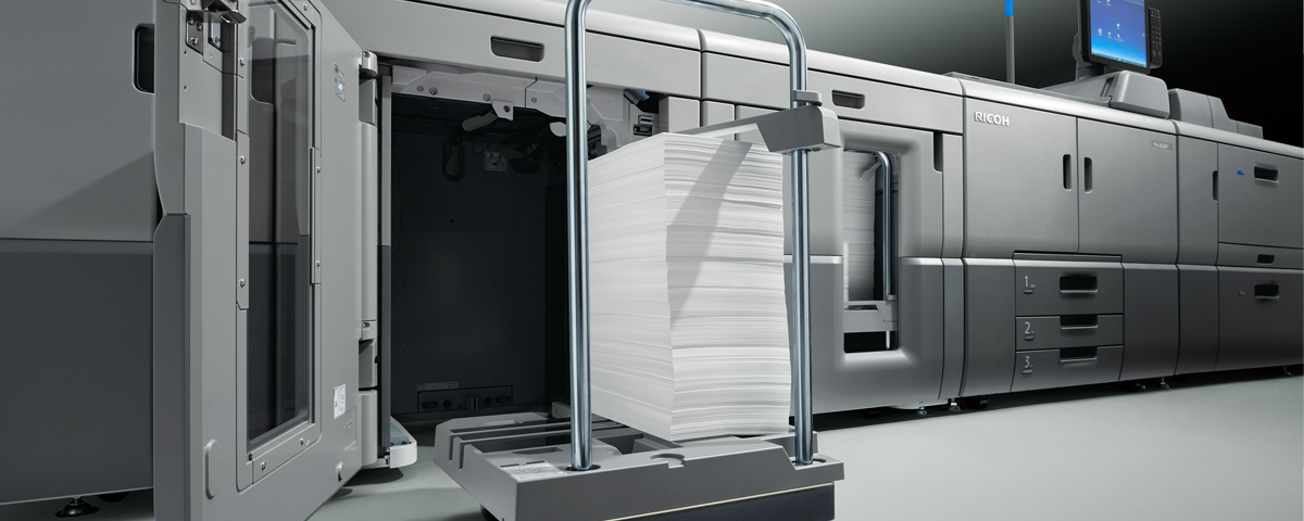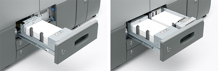 1段目のトレイにA4サイズで1,100枚の用紙を2セット(左右合計2,200枚)収納可能。マシンを止めずに用紙補給ができるので、ダウンタイムを減らすことができます。