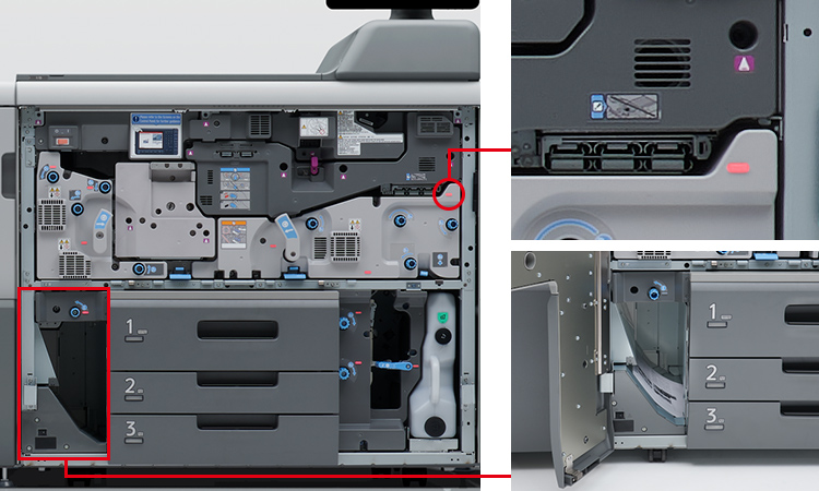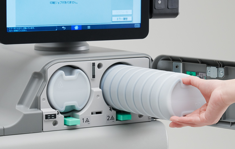 トナーボトルを同時に2本セットでき、エンジン作動中でもトナーボトルを交換可能。大量印刷時の生産性アップに大きく貢献します。