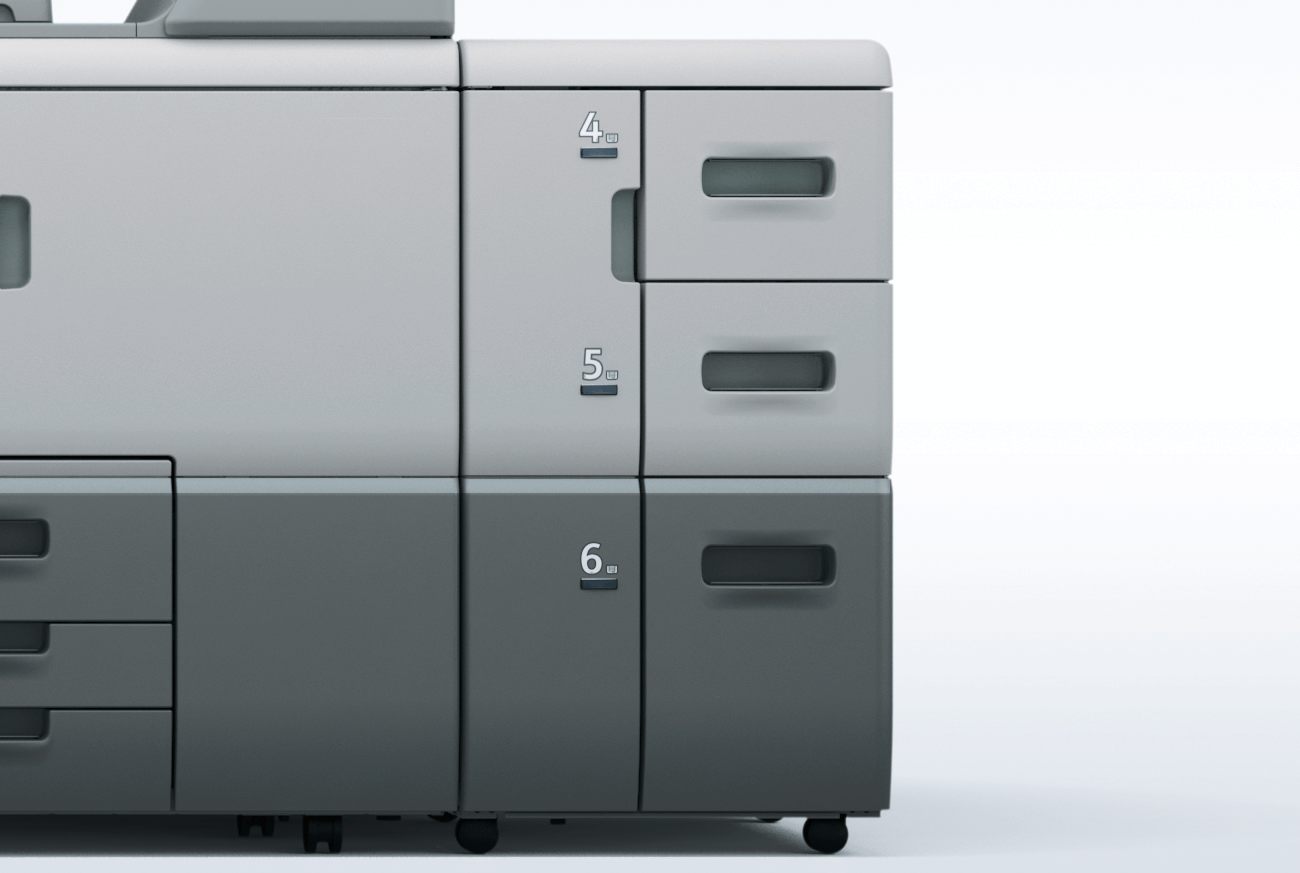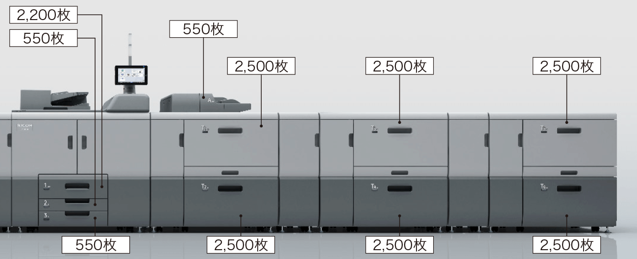 最大5,000枚(2,500枚×2段)*1の給紙が可能です。3連結まで可能*2で一度にたくさんの出力が必要な場合や多様な用紙銘柄を使用する場合に用紙を補給する手間を軽減します。