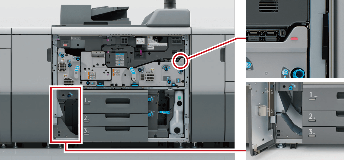本体内部に色覚の多様性に配慮したカラーを使用。どの部分で紙詰まりが起きているか分かりやすく誘導します。