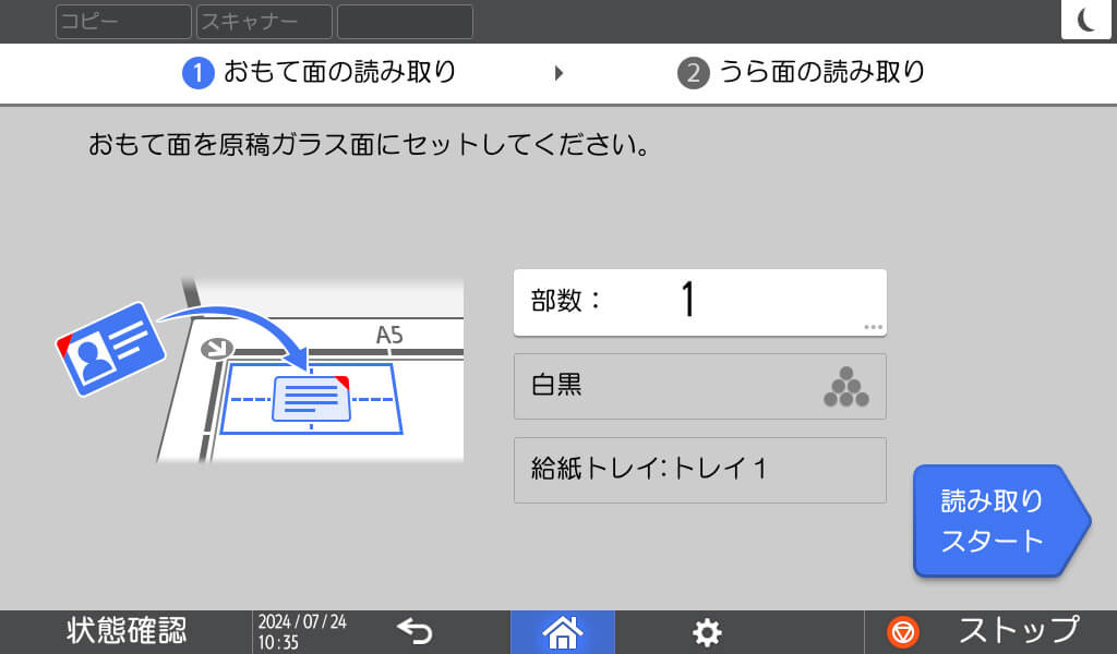 カードの表面・裏面を読み取り、用紙の上下に集約してコピーできます。例えば免許証や保険証などの控えをとる際に便利です。