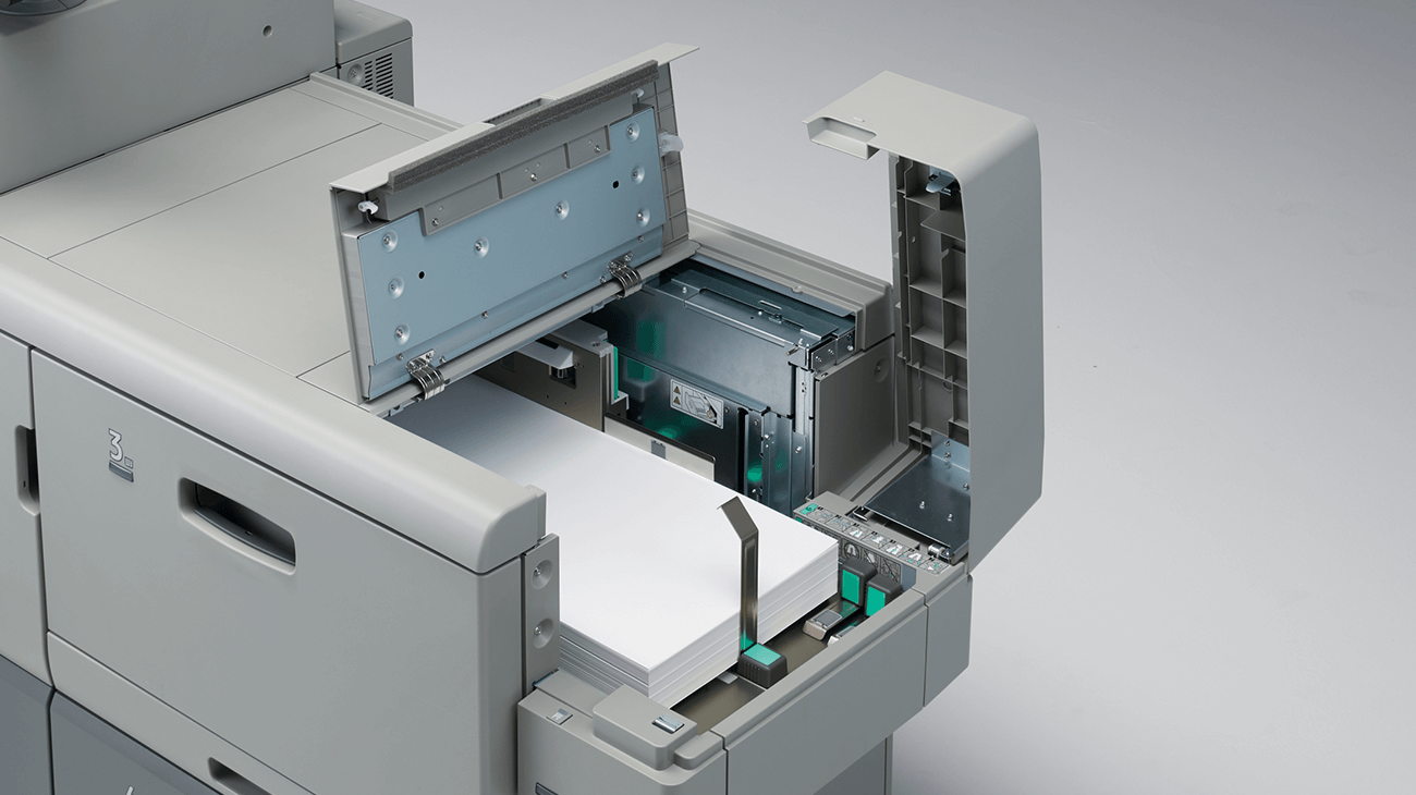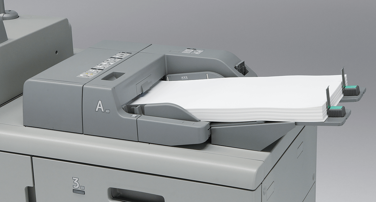 紙詰まり発生時の後続紙を退避させるパージエリアを設け、効率的な紙詰まり処理が可能。さらに、重送などの用紙をパージエリアに送り込み、再度給紙を行ない印刷再開する「自動復帰機能」により、ダウンタイムを大幅に短縮します。また、不定形サイズの用紙は、3500枚フィニッシャー SR5120*(オプション)の上段トレイへ排紙。より幅広いサイズの用紙に対応しています。