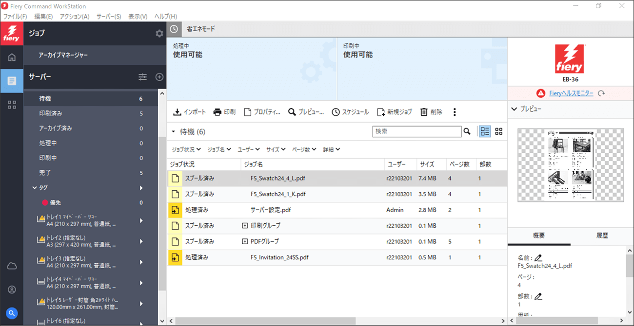 プリンターコントローラーに送信されたジョブのプリントオプションの書き換えや印刷順の変更、プレビュー表示が可能です。また画面上には、サーバーの状態・ジョブの処理状況・処理中のジョブが表示されるので、プリンターコントローラーで処理を行なう全てのジョブを統合的に管理することが可能です。
