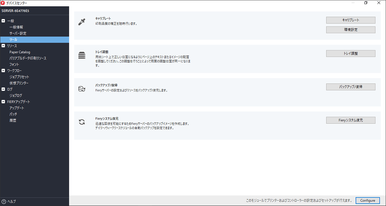 Fiery® Command WorkStation™のデバイスセンターでは、プリンターコントローラーの統合管理・設定を行ないます。操作画面は管理内容に合わせてカテゴライズされ、目的の機能にすぐアクセスすることができます。ツールや機能の設定画面には、関連する別のカテゴリーの機能やモジュールを呼び出すリンクもあるため、機能を探す手間をかけずにプリンターコントローラーの設定・管理が可能です。