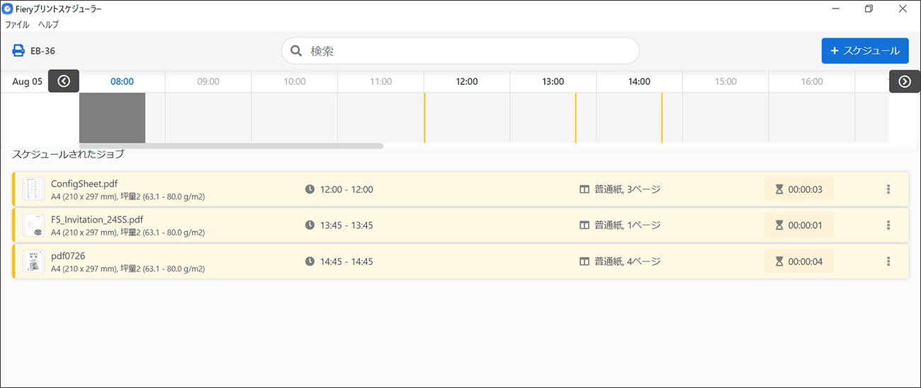 印刷時刻のスケジューリングが可能です。予定されている印刷ジョブを一覧で確認できるため、マシンが空いている時刻に他のジョブを印刷するなど、効率よく印刷を進めることができます。