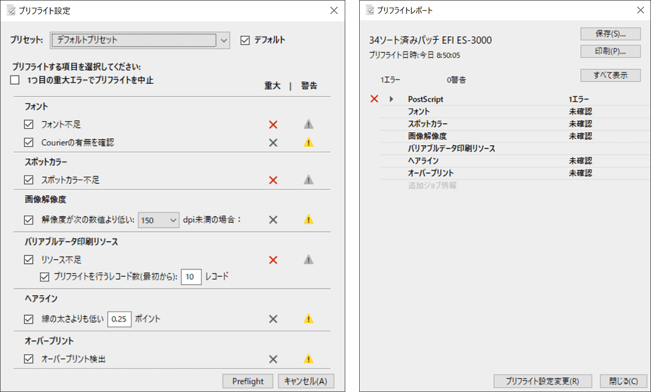 印刷トラブルになりうるデータ内の要素をチェックすることが可能。