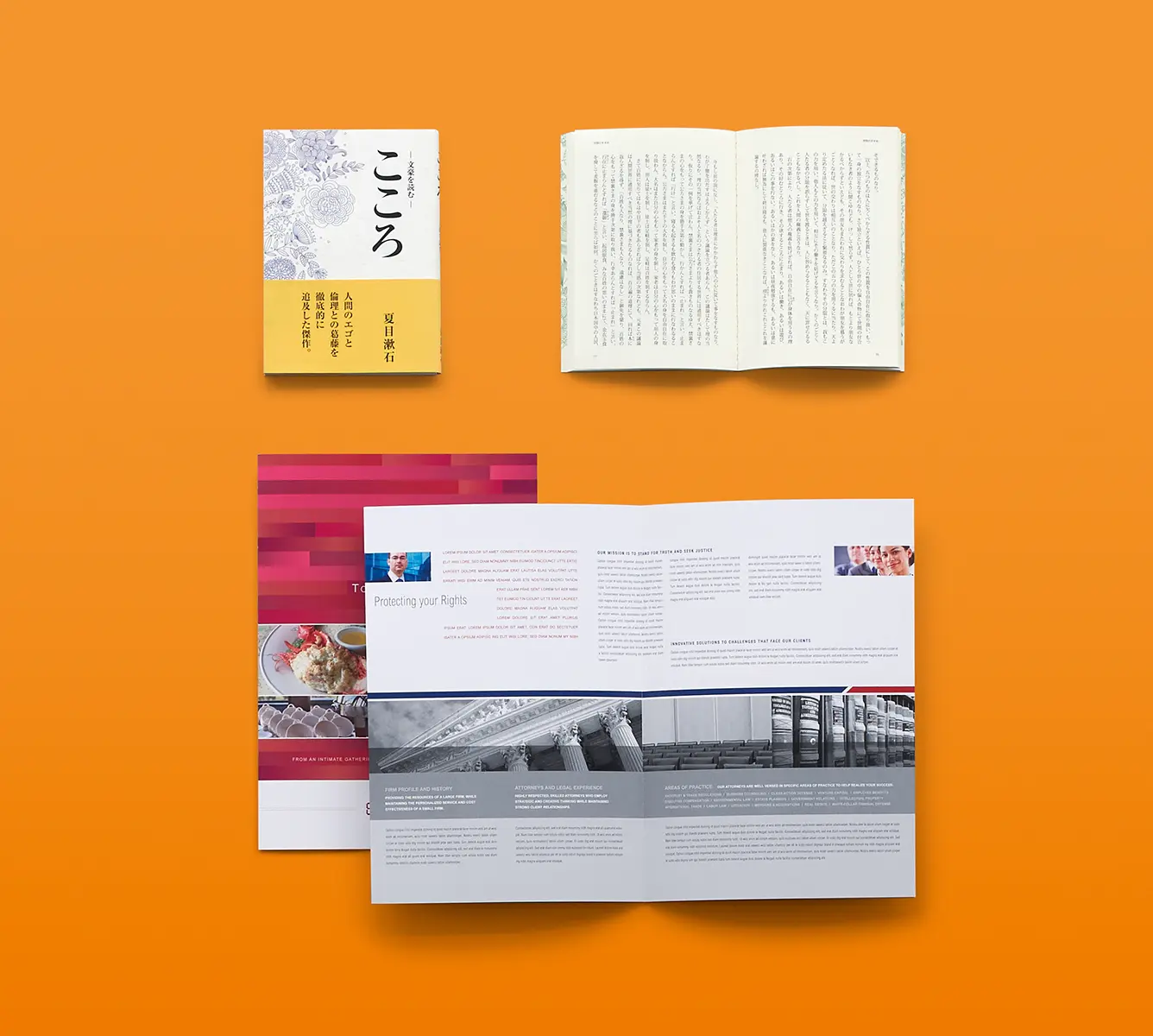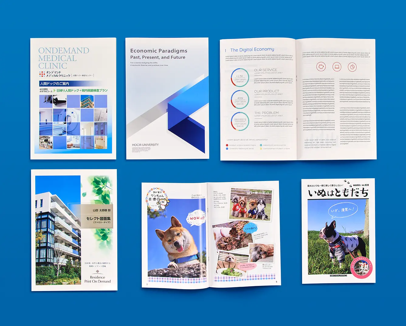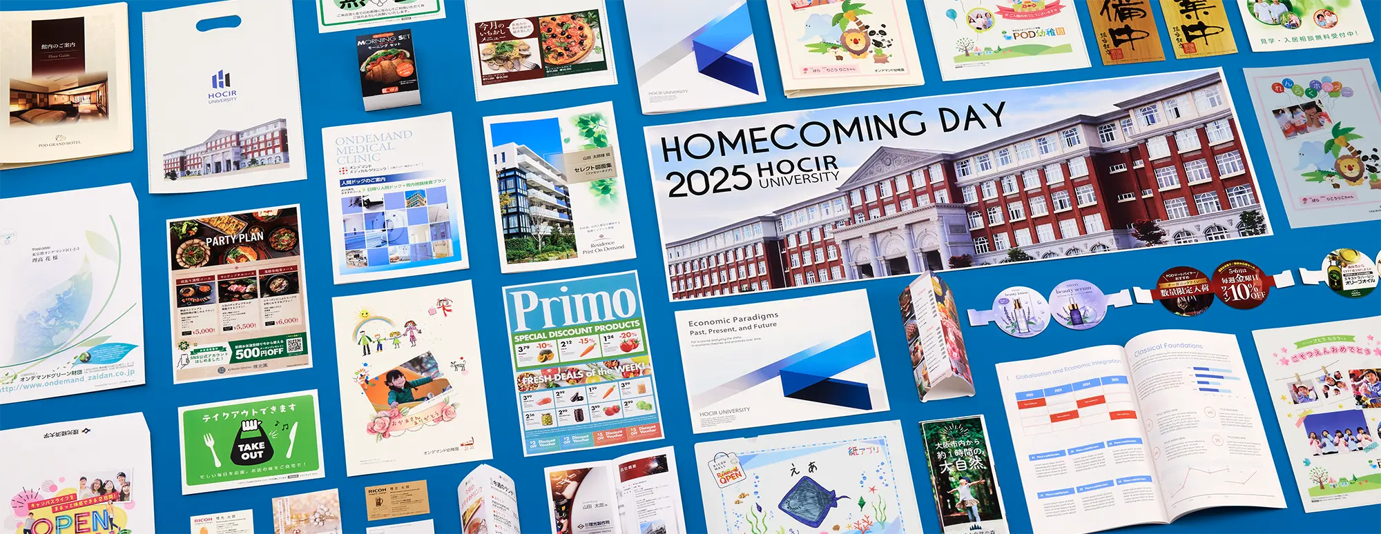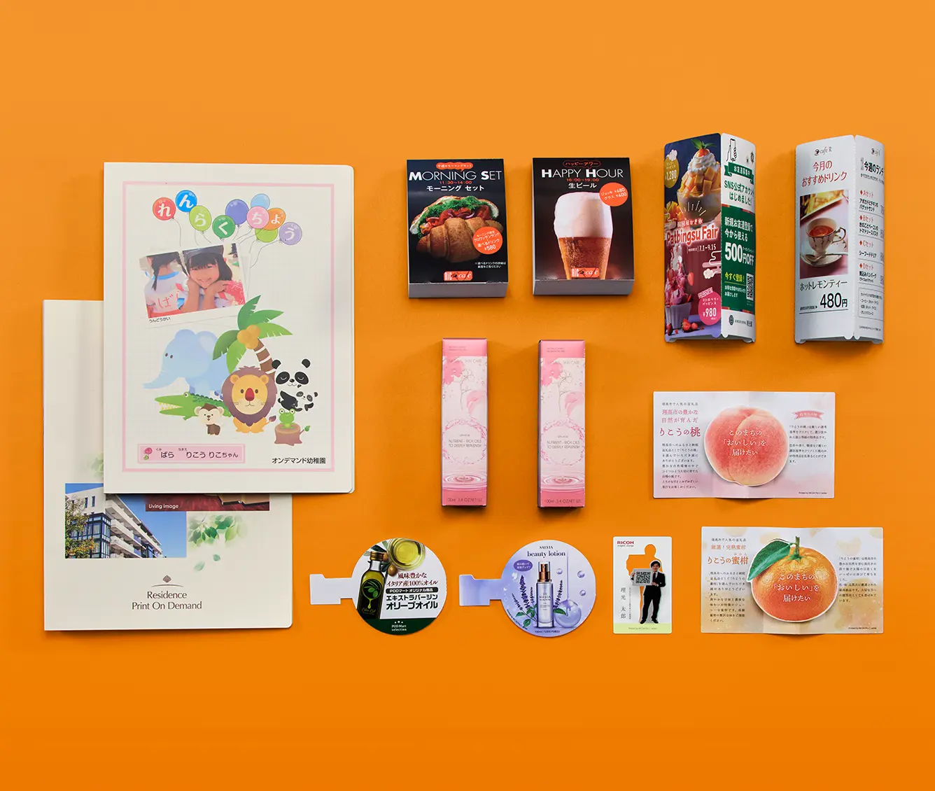 紙厚52.3~360g/m2、用紙サイズ90×139.7mmから330.2×1,300mm*1*2に対応。さまざまなサイズの用紙が取りあつかえます。チラシやパンフレット、DM、POPなどの販促物や名刺が制作可能。また、自社でデザインしている場合、急に必要になった際もすぐに印刷することができます。