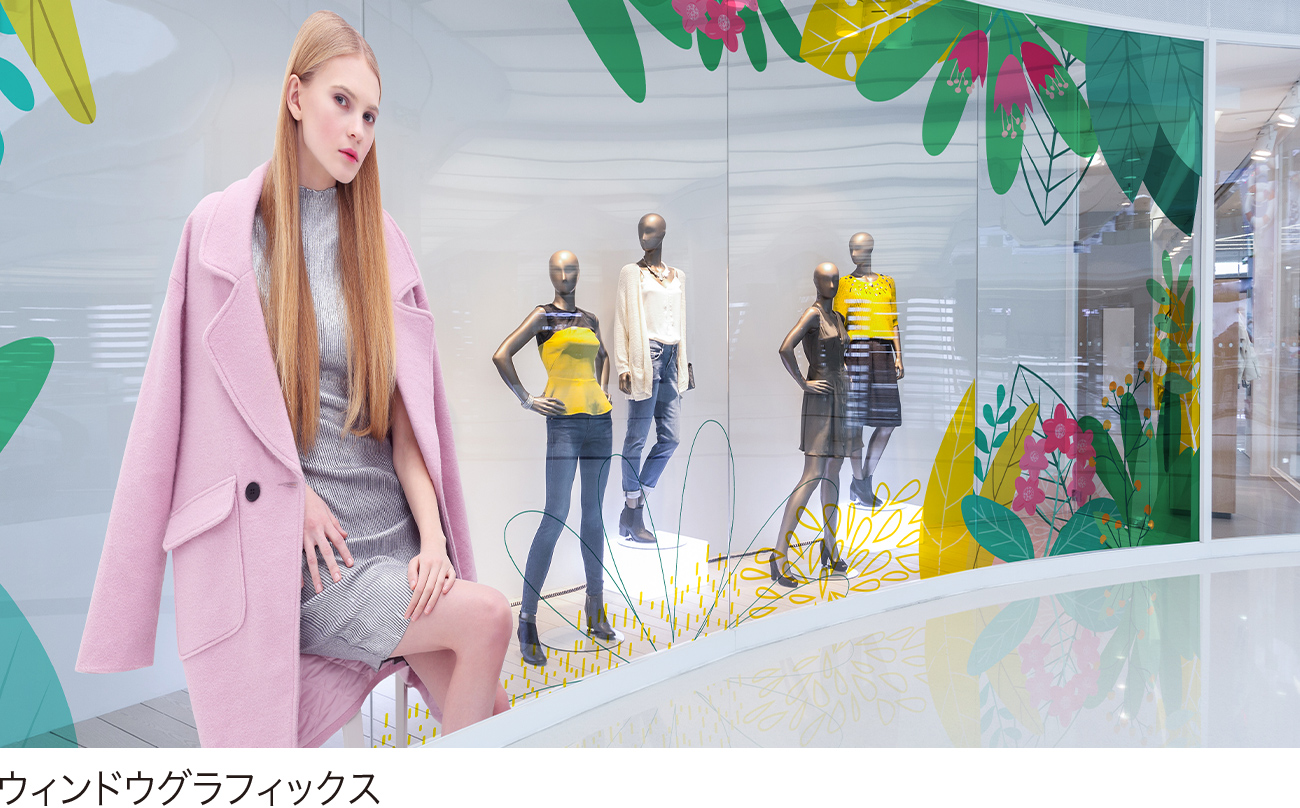 透明素材に白インクを重ねて表現することで、ショーウィンドウなどを色鮮やかに演出できます。