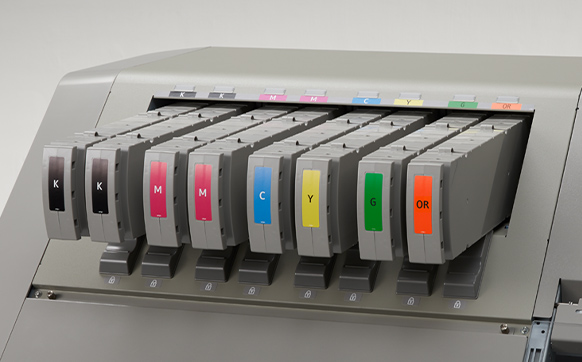 8本装着できるインクカートリッジは、用途に合わせてカラー構成をお選びいただけます。生産性の高い4色モードのほか、高画質な6色モード、高い演出を施したい4色+ホワイトモードが選択可能です。