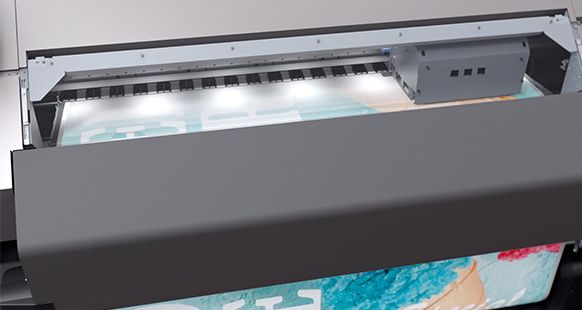 インクヘッドの位置をずらすスタガ配列の3ヘッドを搭載。一度に広い面積に印字できるため、標準モード25.0m²/h*の高速プリントを実現します。大判ポスターやウォールデコレーションなど、さまざまなアプリケーションを短時間で制作できます。