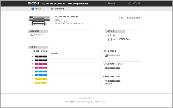 新開発のWeb Image Monitorでは、デバイス設定のほかにホームを用意。ネットワーク上にあるパソコンのWebブラウザから離れた場所にあるインクや使用メディアなどプリンターの状態が一目で確認できます。