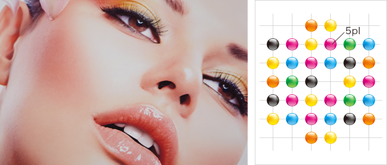 5つの印刷モード(スーパードラフト/ドラフト/標準/高画質/最高画質)で、吐出するインク滴のサイズをマルチジェッティングテクノロジーで打ち分け、滑らかで深みのある表現を実現できます。