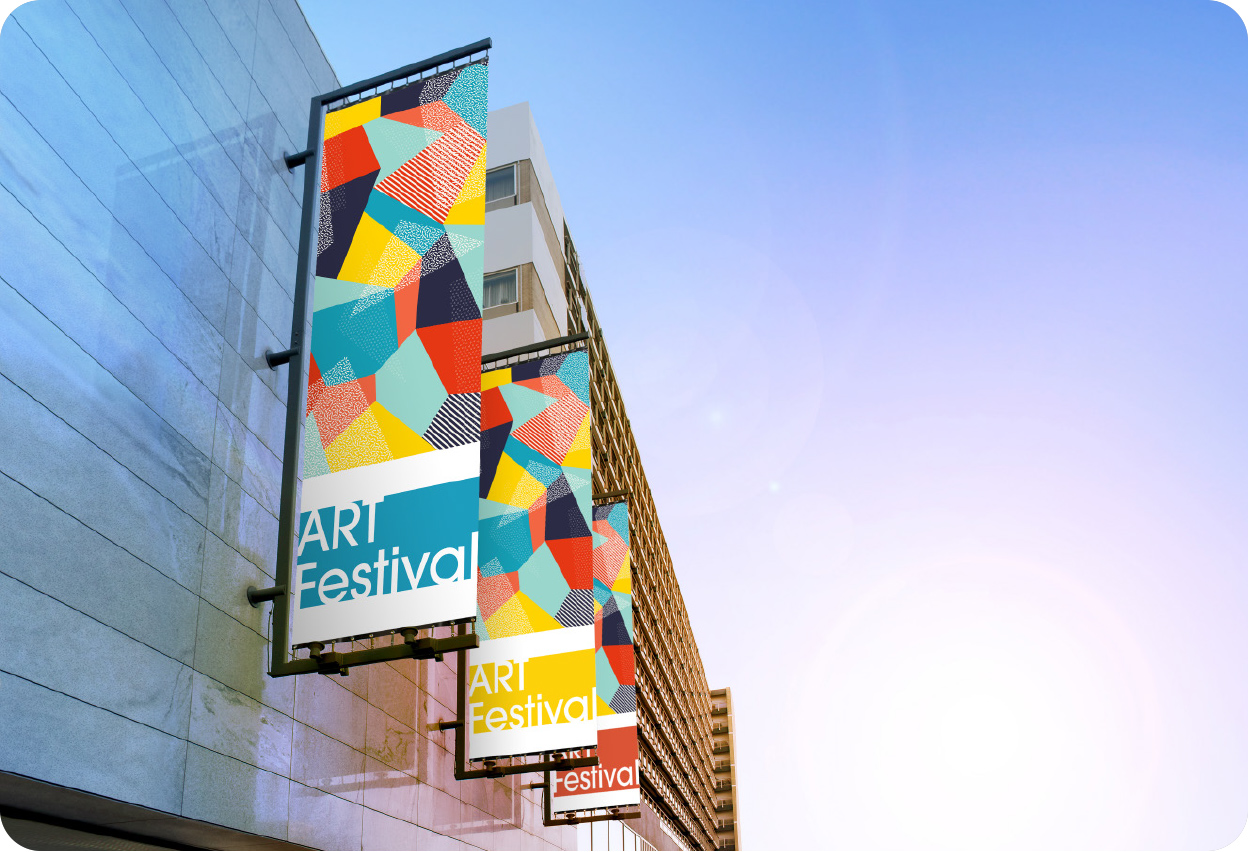 壁や天井に吊すテキスタイルも鮮やかに。イベント告知などの訴求力アップに貢献します。