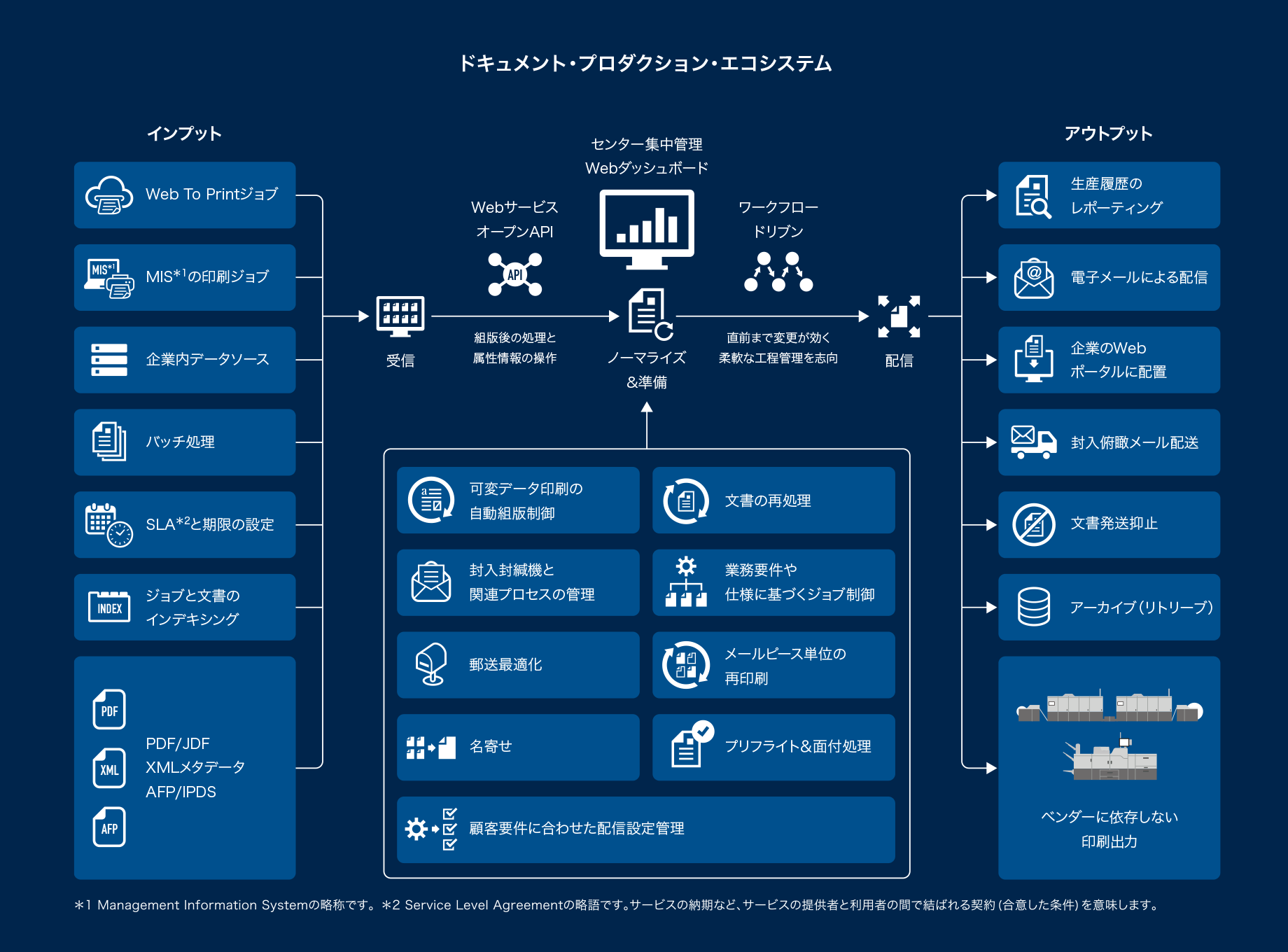ドキュメント・プロダクション・エコシステムのコンセプトの下、強力なデータベースと堅牢なワークフローエンジンおよび、すぐに使えるプログラム群により、基幹業務印刷と印刷サービスに欠くことのできない統合的なワークフロー管理を実現します。