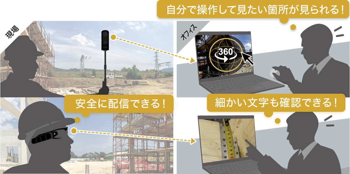従来にない360°&4K映像の配信で、手に取るようにわかりやすい遠隔臨場が可能。RICOH THETAの360°映像は、現場の全体像をつかみやすく、さらにスマートフォンやウェアラブルカメラでのクローズアップ映像の配信も可能。発注者は立会のための出張回数が減るため、劇的なコスト改善につながります。受注者は発注者との日程調整が容易になり、より円滑な現場管理が可能です。