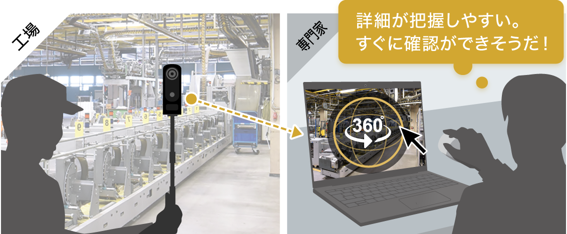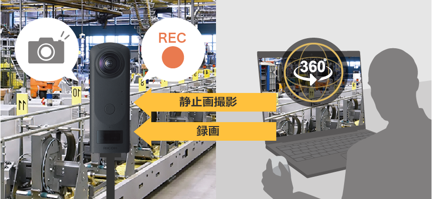 RICOH THETAを現場に置けば、見る人それぞれが360°自由な画角で映像を見ることができて、見逃しがなくなります。