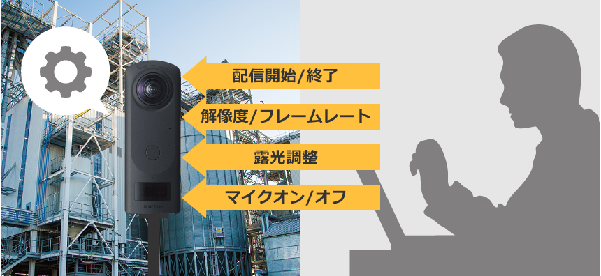 配信開始/終了、解像度/フレームレート変更、露光調整、マイクオン/オフなど、遠隔からデバイスの制御ができます。