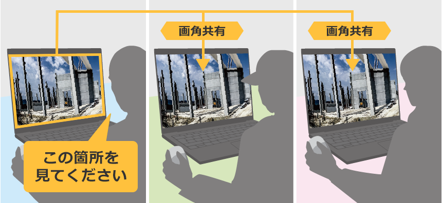 RICOH THETAの360°映像を閲覧している時に、自分が見ている画角を他の人へ共有することで、全員の視点を揃えて、認識合わせができます。