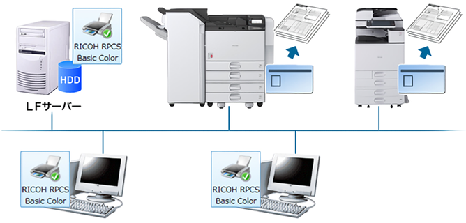 ICカード認証やパスワード認証による、LF(ロケーションフリー)印刷は「クライアントの利便性を向上」させるだけでなく、いつ誰がどんなファイルを何枚コピーや印刷したかなどのログ収集・利用管理機能で「情報漏えい抑止」に効果があります。 従来は、異なる機種毎のドライバーで運用する必要がありましたが、「RPCS Basicドライバー」は、異なる種類の複合機/プリンターを1つのドライバーで運用することが可能です。