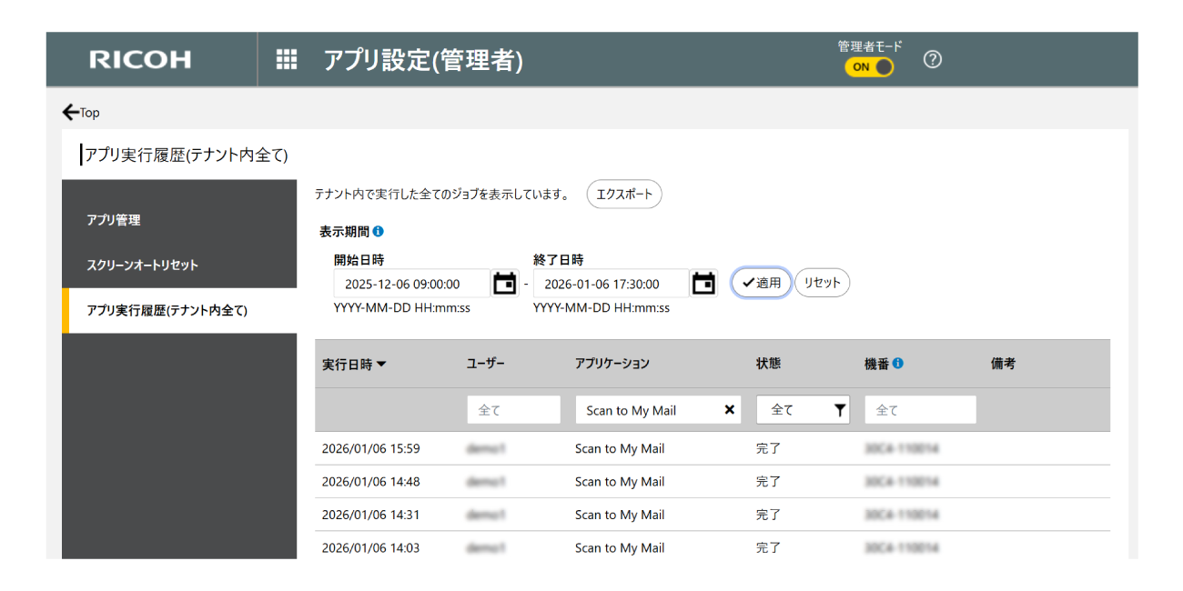 | 送信履歴 | 開始日時、終了日時、状態 | |