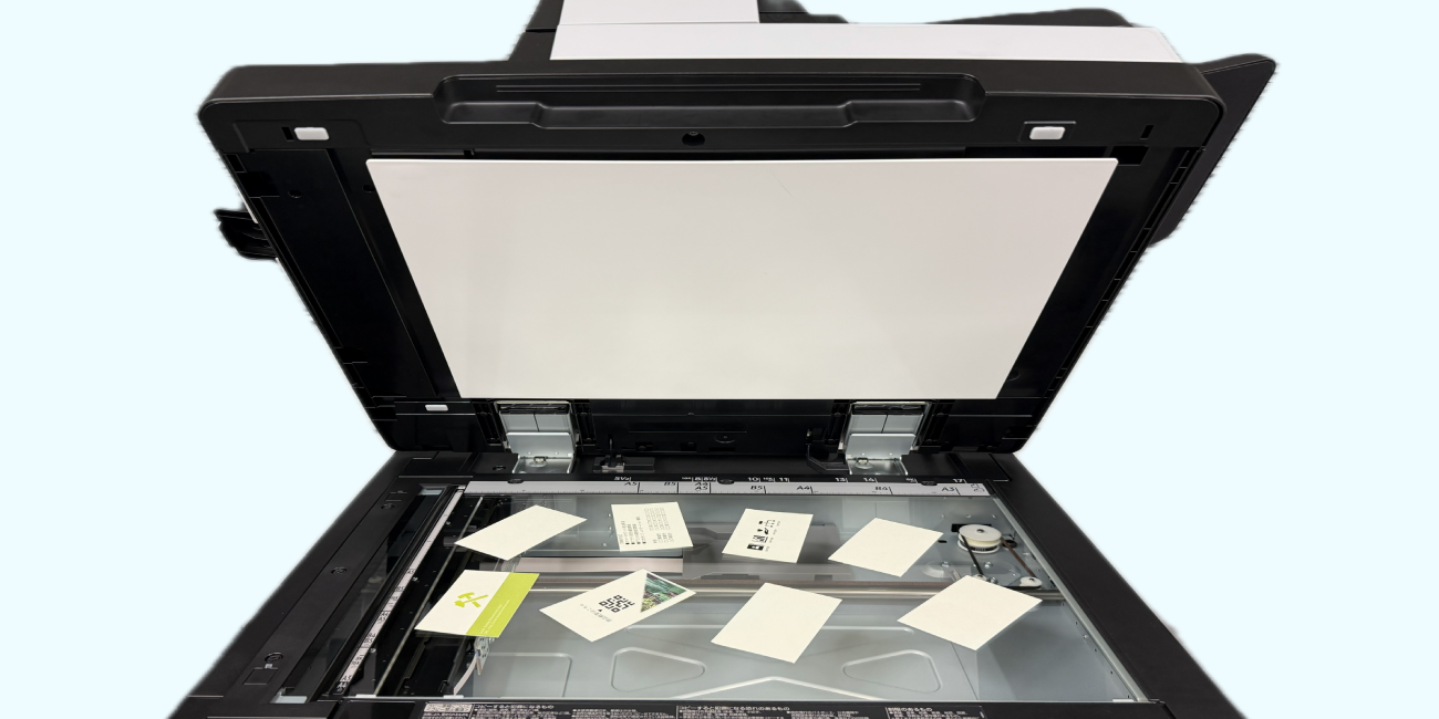 ※複合機の圧板を開けた状態でスキャンする場合、黒色に近い色の原稿は画像の切り出しができないことがあります。その場合、原稿に黒い紙をかぶせてスキャンすることで解消できます。