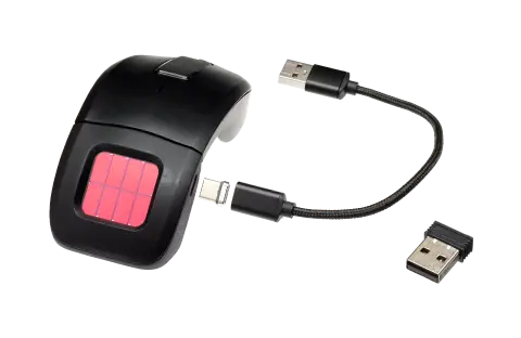屋内の明かりで高い発電力を発揮するリコーの固体型色素増感太陽電池とビフレステックが選定した高性能のリチウムイオンキャパシタを搭載し、1日1時間程度のパソコン操作でマウスを利用する際は充電不要注1、注2、注3で利用できます。(1日12時間600lxの照明が照射されていることが条件)