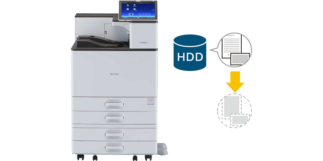 パソコンからの出力などによるHDDの残存データやユーザーデータを上書き消去する機能(逐次消去/一括消去)を搭載。残存データからの情報漏えいを抑止します。