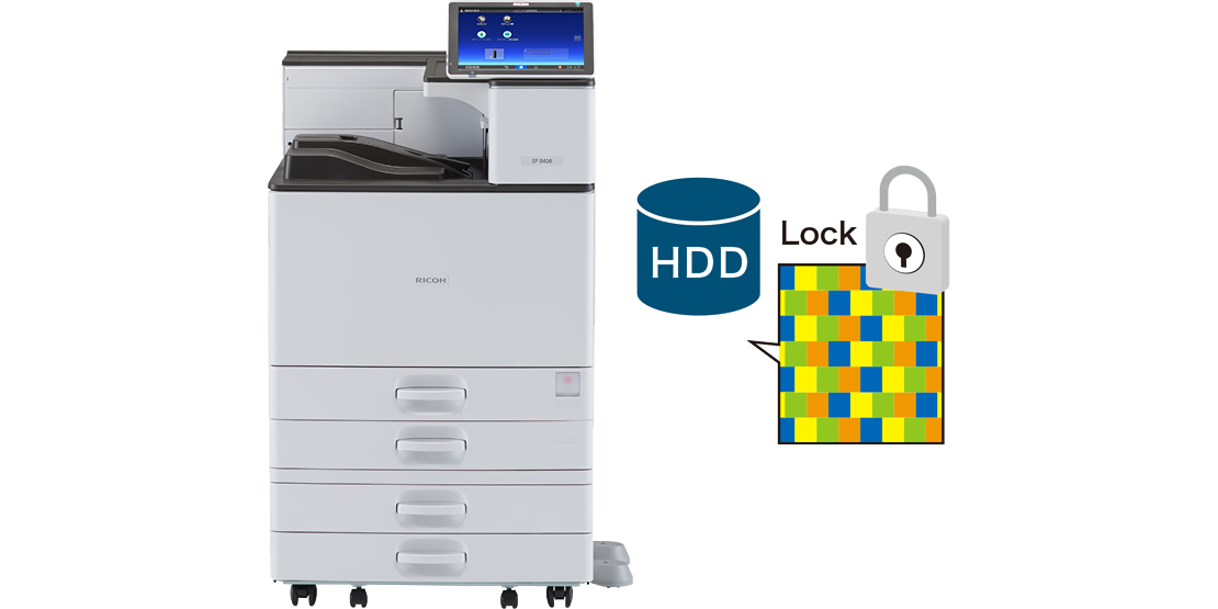 アドレス帳データ、認証情報、蓄積文書などは、データの記録時に暗号化するため、本体廃棄時などのHDDの物理的盗難などによる情報漏えいを抑止できます。