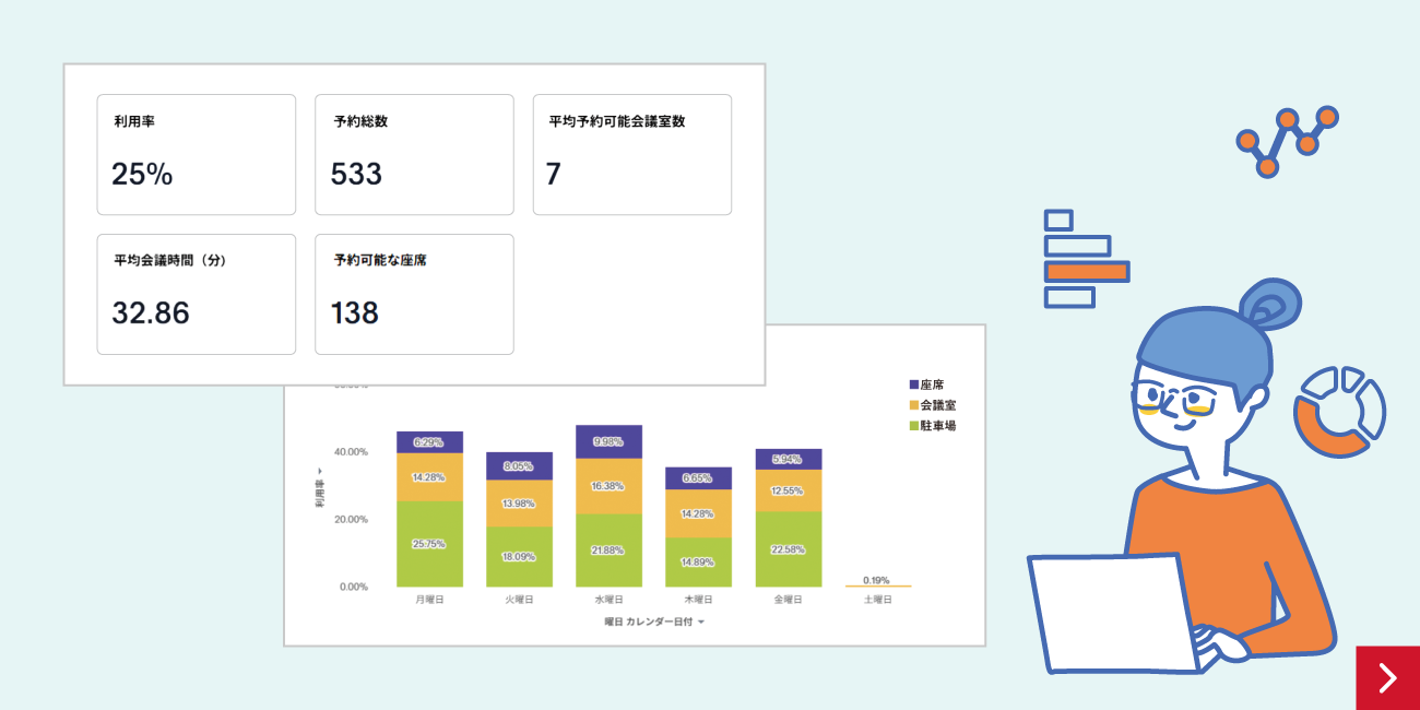利用者は、会議室・座席・駐車場の確認および予約、ならびに受付の予約を、PCのブラウザーまたはスマートフォンから行います。予約情報はRICOH Spacesのクラウドと同期され、各種端末に反映されるとともに、クラウドを通じて各種アプリケーションともデータ連携されます。管理者は、クラウド上で予約設定を行い、各種利用状況の分析レポートを閲覧できます。