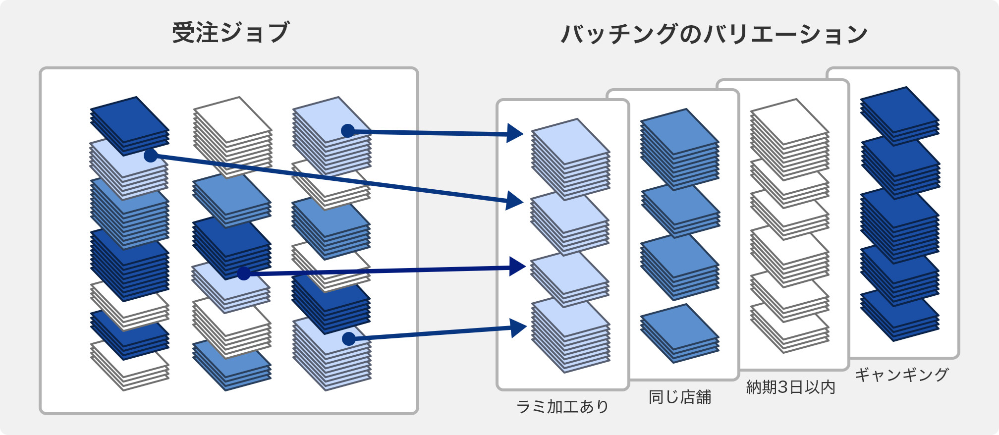 「Batch」とは「括る」こと。RICOH TotalFlow BatchBuilderは、同じ属性のジョブを括って「ジョブのかたまり」をBuildする(組み立てる)ことで、作業効率を改善します。