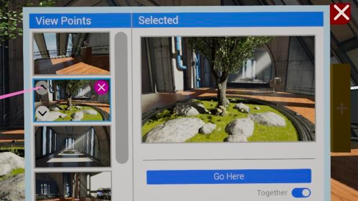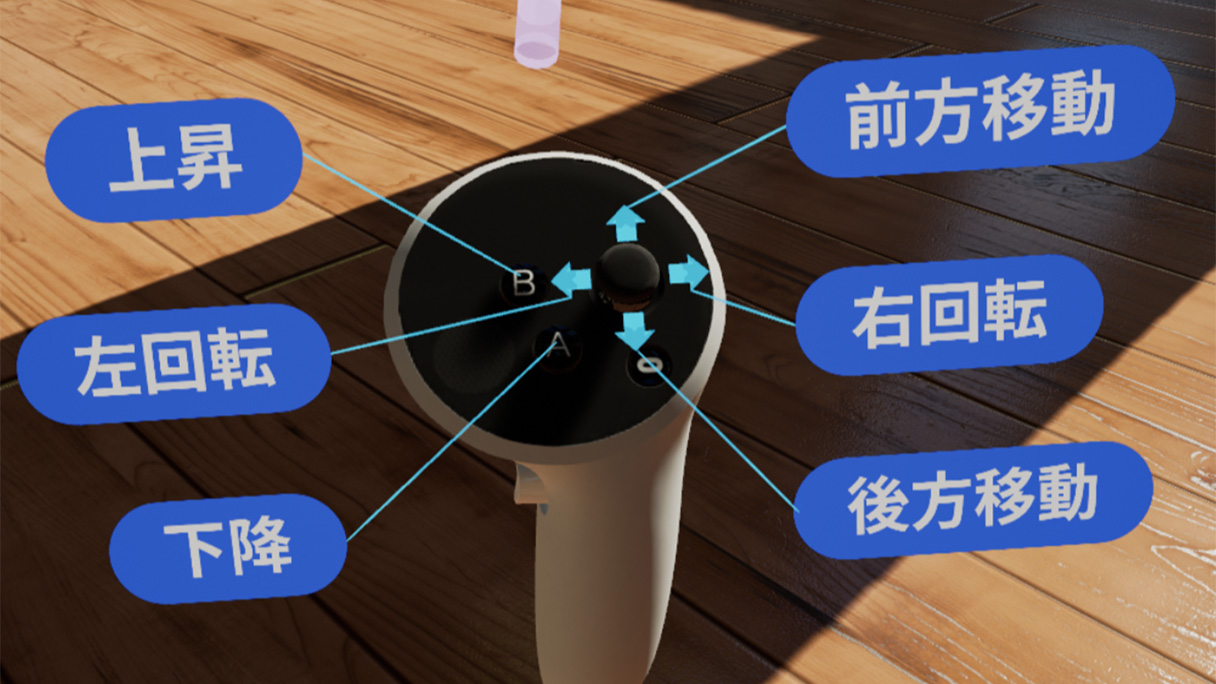 スムーズに操作できるインターフェースを開発。自由に空間内を移動でき、ツアー機能での全員移動や音声での文字入力などコミュニケーション機能も多彩です。