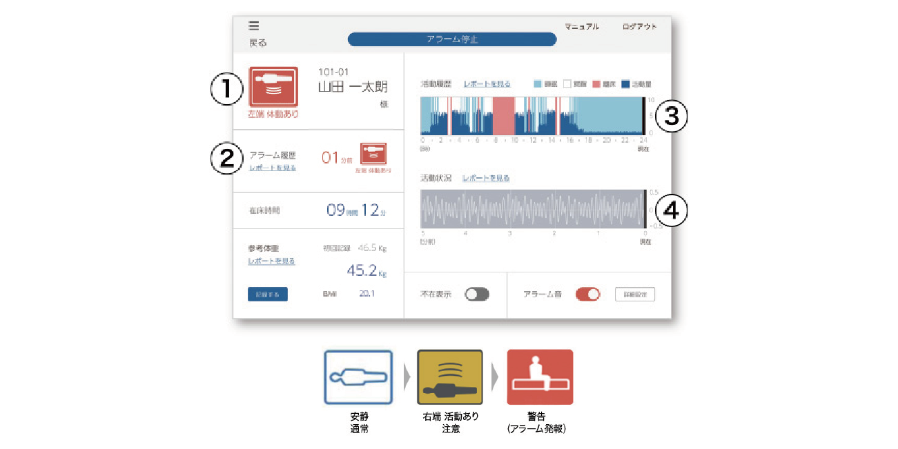 利用者様のベッド上の状態(位置、体動、姿勢など)と24時間の生活リズムを把握して、安心と健康生活を支援します。